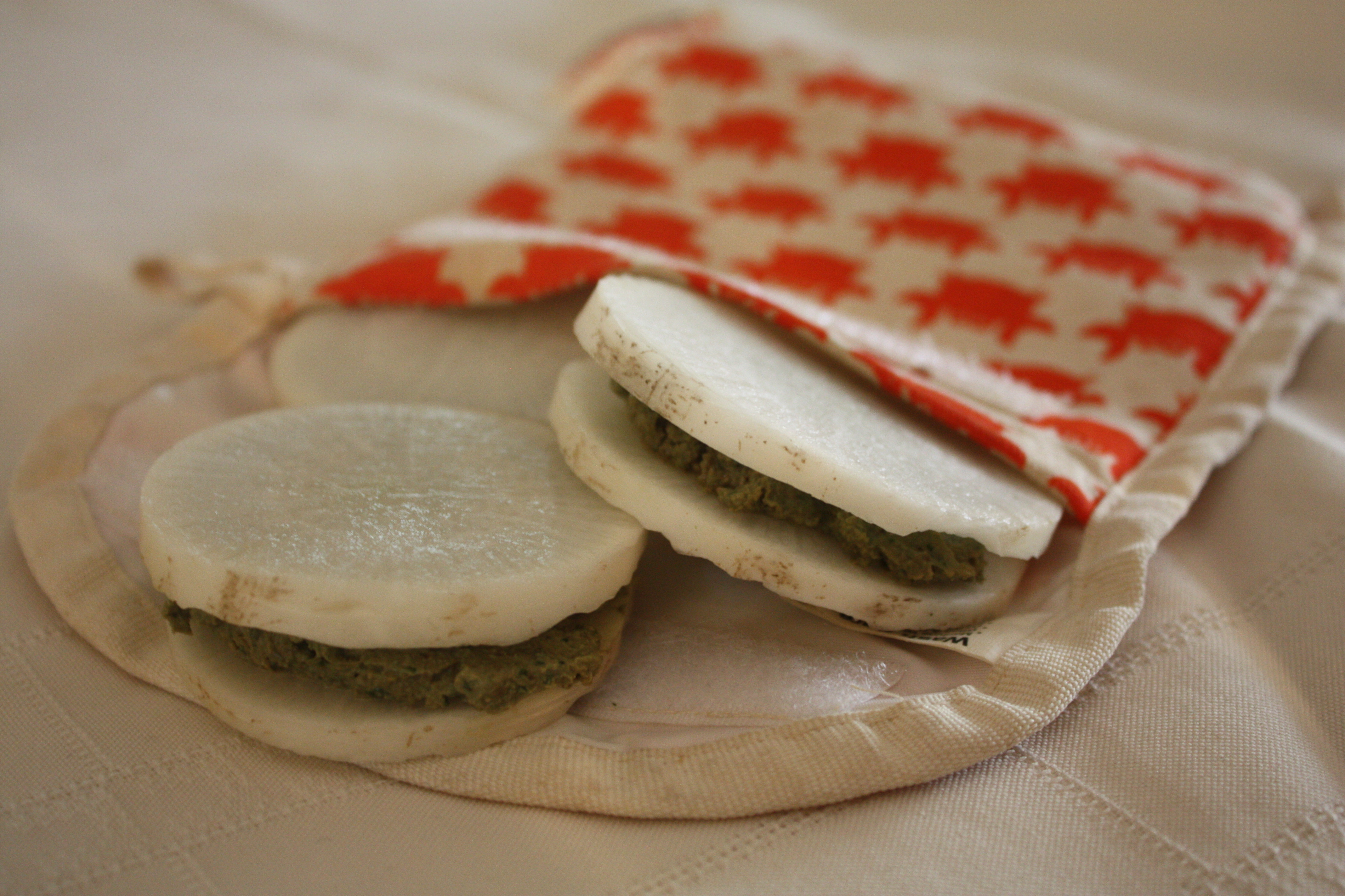 Sandwich, Daikon-tartinade. Le daikon est un radis japonais (qui pousse au Québec!) tellement délice, croustillant et plus doux que le radis.