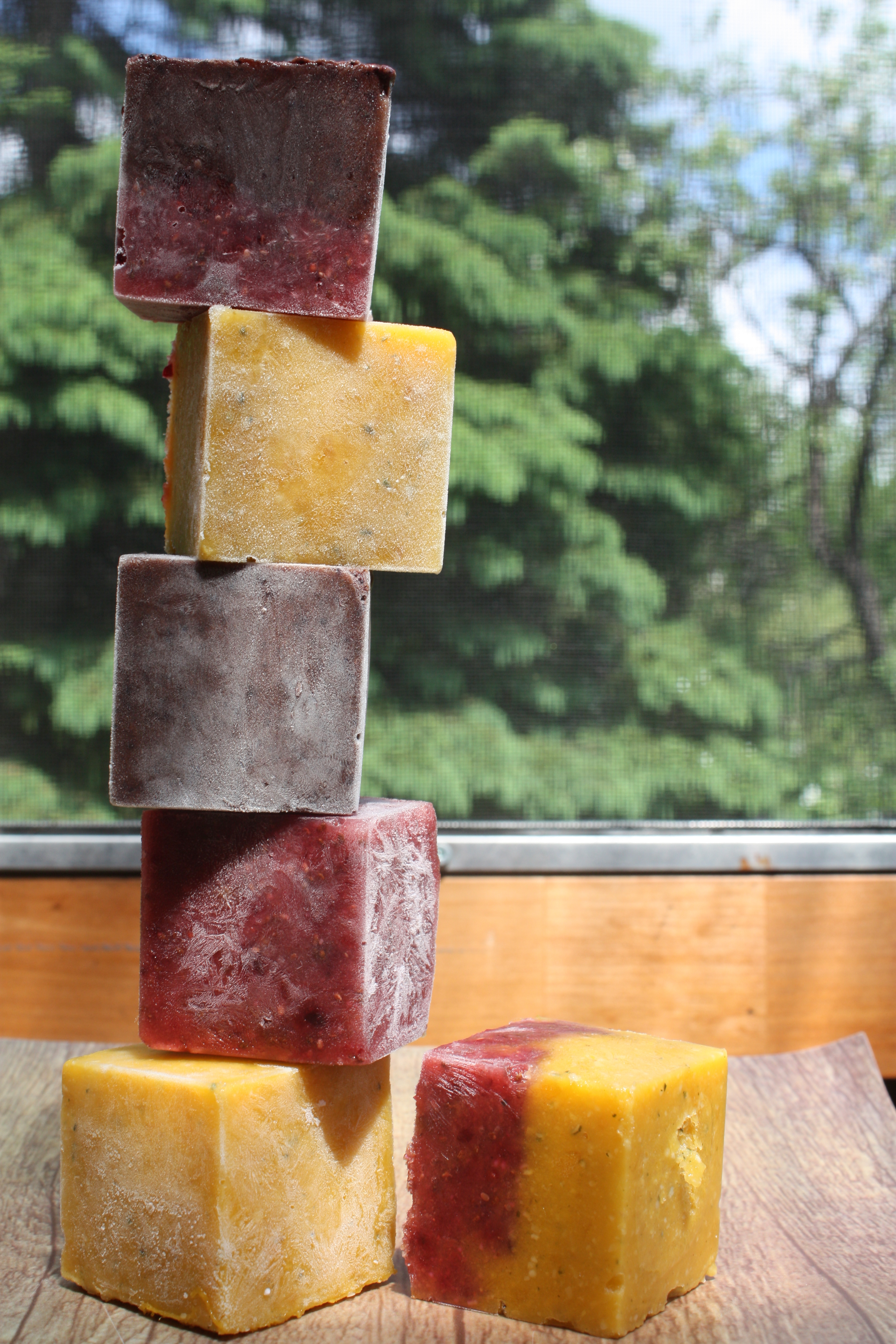 Dans les recettes, je vous donne, les glucides et protéines pour tout le mélange, c’est un concentré en compote. À vous de séparer les portions en conséquence et faire congeler dans des bacs à glace ou comme moi dans les merveilleux moules en silicone d’une demi-tasse de chez Épicure. Une fois gelé, on les transferts dans un sac de plastique et on inscrit dessus les glucides et protéine par portions. On conserve au congélateur pour en avoir sous la main.